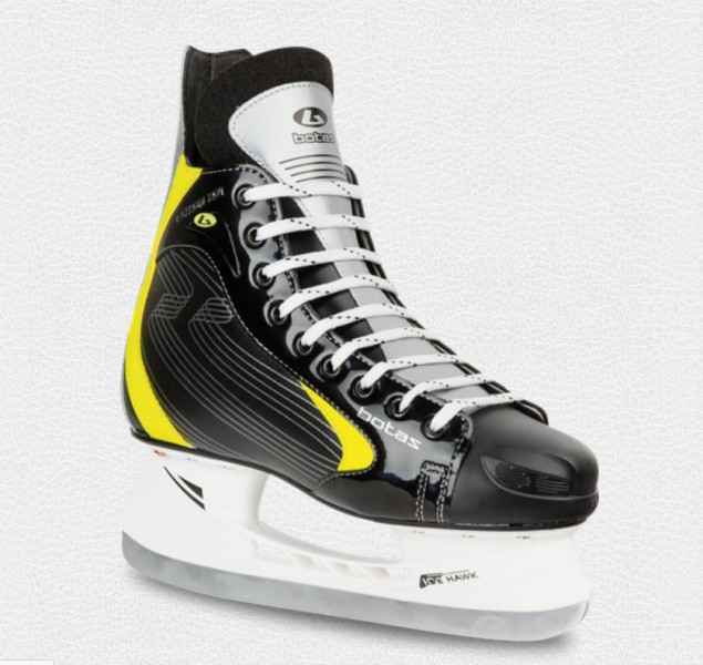 Model v atraktivním černo/žlutém designu pro aktivní sportovce s ochrannými prvky ergonomického střihu svršku s bočním zesílením, vrch ze syntetiky a PA tkaniny je zpevněn TST špičkou z odolného plastu spolehlivě chránící prsty nohou, vypolštářovaná podšívka ze syntetického veluru, dodává se s bruslí BOTAS ICEHAWK CARBON Ultra Steel white. Cu nýty v patě.