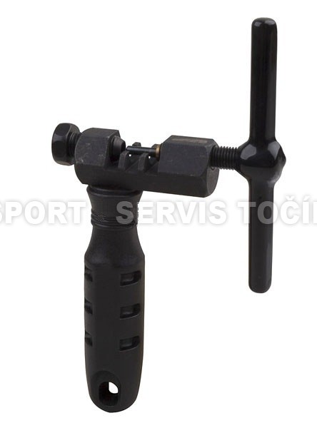 Nářadí PRO-T - popis: ocelový vytláčecí čep, nastavitelný doraz s otvorem, pro úzké i široké řetězy,ergonomická rukojeť, klička potažená gumou, délka madla 9 cm, délka kličky 9,5 cm.