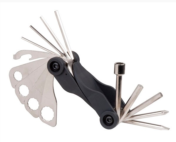 Nářadí PRO-T - popis: 14-ti funkční nářadí: inbusové klíče 2/2,5/3/4/5/6 mm, prstencový klíč 8/10/12/13/15 mm, šroubovák plochý a křížový, centrklíč, otvírač lahví.
