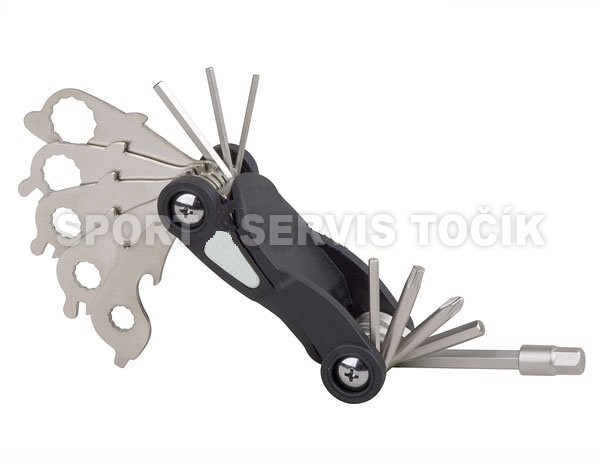 Popis: Nářadí PRO-T, cyklo nářadí 20 funkcíNářadí PRO-T - popis: 20-ti funkční nářadí: inbusové klíče 2/2,5/3/4/5/6/8 mm, prstencový klíč 8/9/10/13/15 mm, šroubovák plochý a křížový,otvírák, 2x montážní páčka, 3x centrklíč,torx 25.Horní a spodní díl se rozloží pootočením.