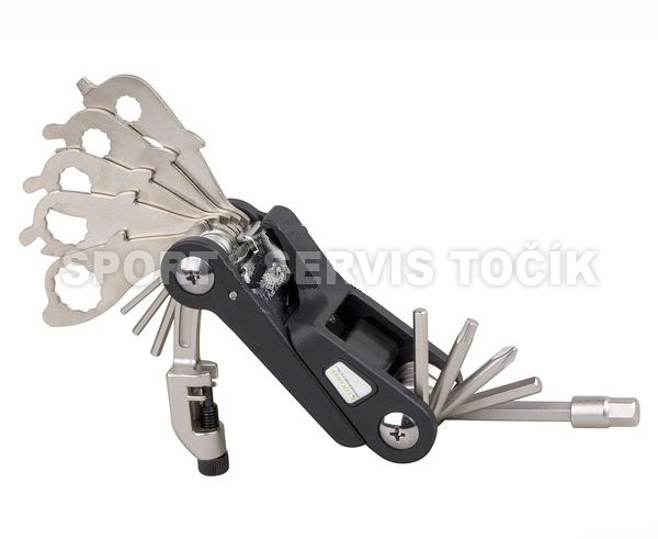 Popis: Nářadí PRO-T, cyklo nářadí 21 funkcí s nýtovačemNářadí PRO-T - popis: 21-ti funkční nářadí: inbusové klíče 2/2,5/3/4/5/6/8 mm, prstencový klíč 8/9/10/13/15 mm, šroubovák plochý a křížový,otvírák, 1x montážní páčka, 3x centrklíč,nýtovač,torx 25.