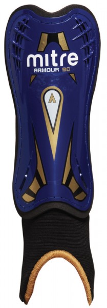 Fotbalové chrániče Mitre. DESIGN Blue/Gold, PROFIL pevný prodyšný chránič (vnitřní, část z EVA), oddělitelná spodní část.