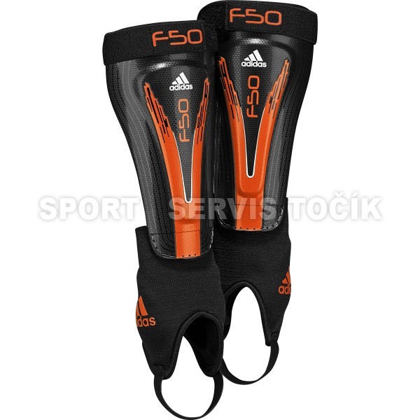 | Fotbalové chrániče holení Adidas s motivem F50. Vyznačují se nízkou hmotností, vysokým stupněm ochrany a flexibilním štítem. Integrované chrániče kotníků přispívají k větší bezpečnosti. |