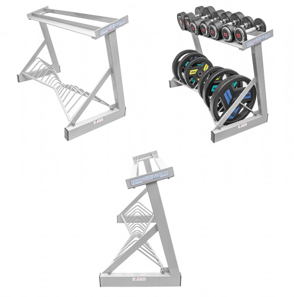 Vrchní police určena pro odkládání jednoruček a to s minimální šíří mezi kotouči 145 mm Spodní rošt stojanu je určen až pro 18 ks fitness závaží - kotoučů (níže údaje o šířce jednotlivých příhrádek): 1. přihrádka 38 mm (uprostřed) určena na 2 ks nejmenších závaží, např. 0,5 - 1 kg dále pak zrcadlově symetricky vždy 2x stejně široké přihrádky a to směrem od středu ke krajům stojanu 2. 25 mm, 3. 25 mm, 4. 30 mm, 5. 45 mm, 6. 50 mm, 7. 55 mm, 8. 65 mm, 9. 65 mm