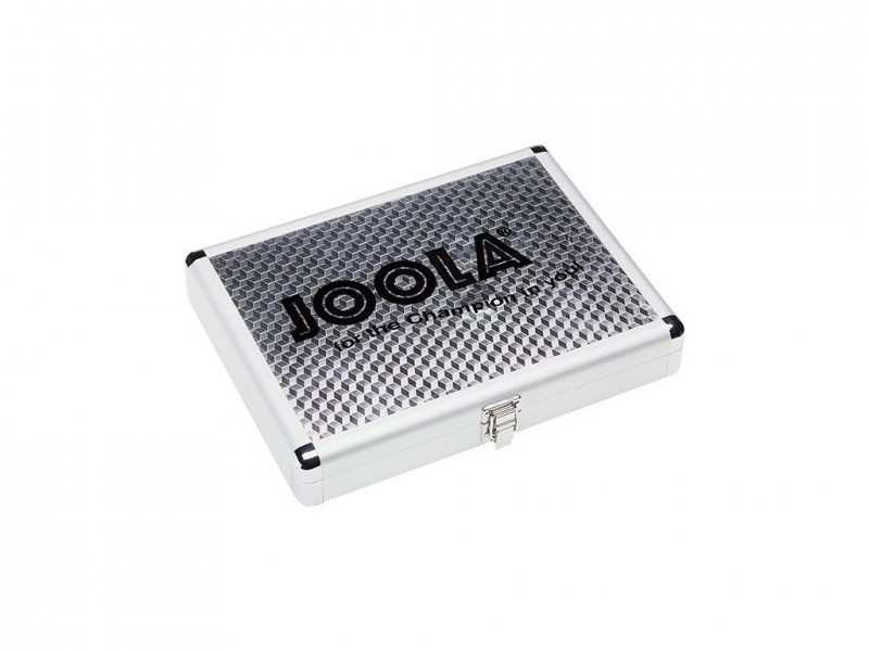 Kufřík Joola - popis: Kufřík vyrobený z hliníku ve stříbrné barvě. Uvnitř polstrován molitanem, místo na jedno pálku a dva míčky.
