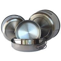 Nerezové nádobí VAR- popis: Nádobí je vyrobeno z kvalitního nerezového materiálu CrNi 18/10 - z vnější strany s povrchem leštěným, z vnitřní jemně broušeným. Nádoby jsou opatřeny lemovkou, která zvyšuje jejich pevnost. Velká a střední miska jsou patřeny prolisem, který zvyšuje stabilitu nádob na vařiči. Nádoby i poklice jsou opatřeny sklopnými držadly, které lze v případě potřeby odejmout. Součástí dodávky je síťový textilní obal. Rozměry