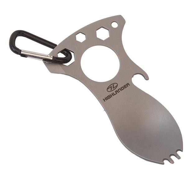 Lžíce Highlander - popis: Multifunkční lžíce . Možno použít jako: lžíci, vidličku, otvírák na lahve, šroubovák a klíč 6,8,10 mm včetně karabinky.