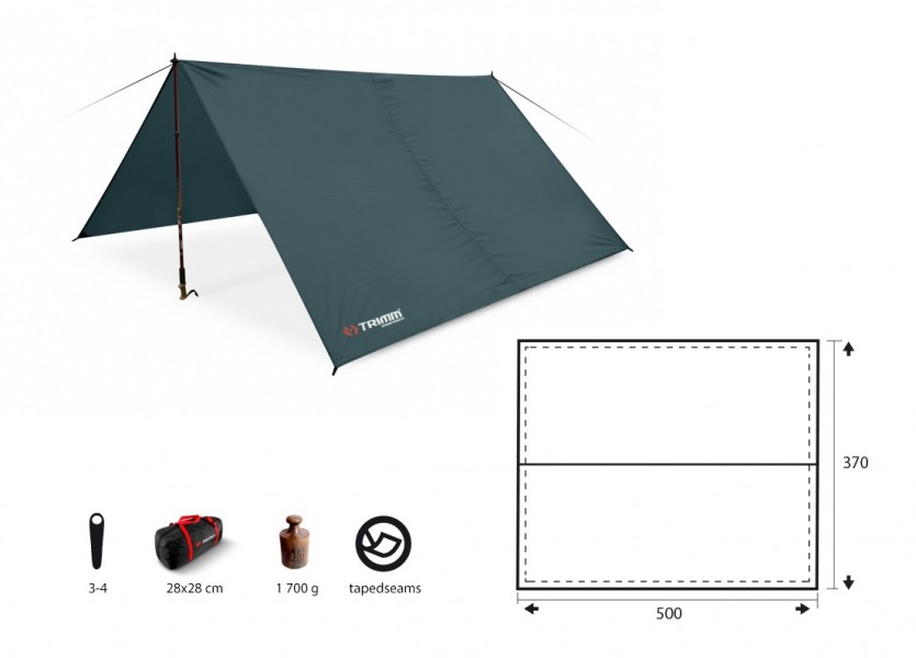 Outdoor přístřešek Trimm - popis: Lehký jednoplášťový přístřešek pro nenáročné turisty, rybáře, trampy a cyklisty. Neslibuje komfort jako klasický stan, ale jeho jednoznačnou výhodou je nízká hmotnost a snadná stavba s využitím teleskopických trekových holí.