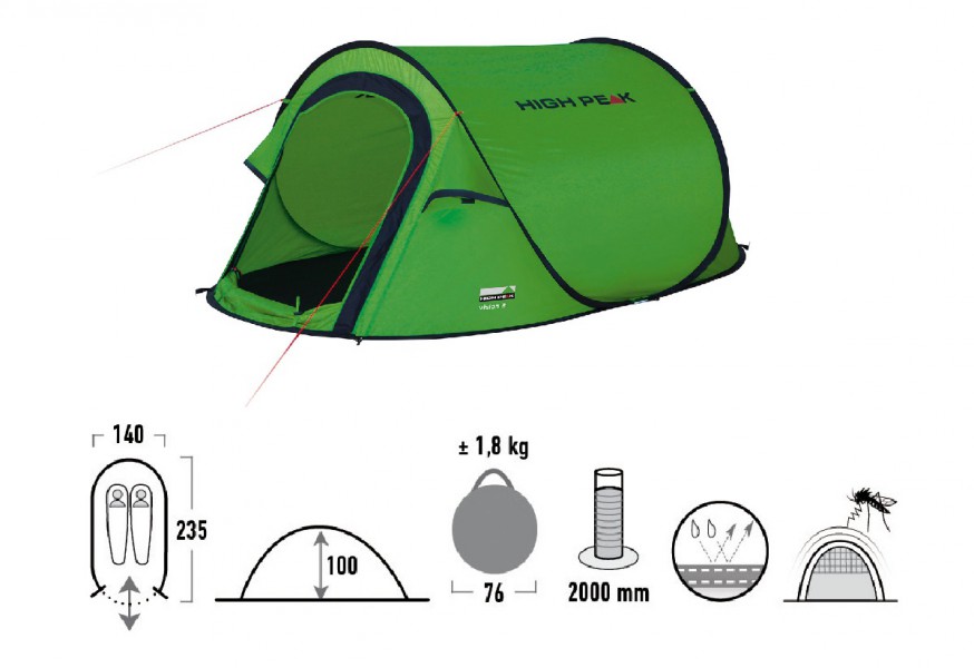 Popis: Stan High Peak, stan Vision 2Turistický stan High Peak - popis: High Peak Vision 2 je samostavitelný, jednoplášťový stan pro dvě osoby s oválnou podlážkou. Předností stanu High Peak Vision 2 je nízká hmotnost - váží pouze 1,8 kg - a skladnost. Ideální pro kempery začátečníky a návštěvníky festivalů. Stan je relativně široký a působí prostorně. Má 3 permanentní větrací otvory pro dobrou cirkulaci vzduchu. Vchod je chráněn moskytiérou za síťoviny. Po otevření se dveře stanu stočí k podlážce. Specifikacfe: