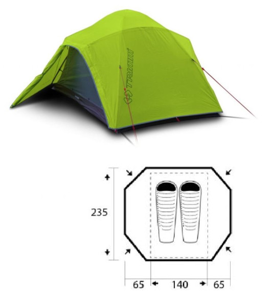 Stan Trimm - popis: Lehký celoroční expediční stan pro 2 osoby. Výbornou stabilitu zajišťuje čtyřprutová duralová konstrukce s křížením v pěti bodech a použité vysoce kvalitní odolné materiály a doplňky. Dva symetrické vchody, nadstandardně prostorné apsidy a dokonalé odvětrání zajišťují dostatečný komfort uživatelů.
