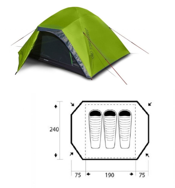 Adventure stan Trimm - popis: Lehký celoroční expediční stan pro 3 osoby. Výbornou stabilitu zajišťuje čtyřprutová duralová konstrukce s křížením v pěti bodech a použité vysoce kvalitní odolné materiály a doplňky. Dva symetrické vchody, nadstandardně prostorné apsidy a dokonalé odvětrání zajišťují dostatečný komfort uživatelů.