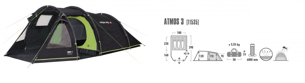 Popis: Stan High Peak, turistický stan Atmos 3, pro 3 osobyTuristický stan High Peak - popis: Prostorově velkorysý, třímístný, tunelovitý, dvouplášťový stan s prostornou předsíňkou s předním i bočním vchodem. Stan má tři stálé odvětrávání s nastavitelnou vzdáleností otevření. Vnitřní stan je vybaven kapsami a držákem na lampu. Vchod je chráněn prodyšnou moskytiérou. Předsíňka stanu je prosvětlena průhlednými PVC okny. Ve spodní části stanu je po obvodu neonově zelená páska, díky které stan bez problémů najdete i v nočních hodinách. Tento stan vás spolehlivě ochrání i v náročnějších klimatických podmínkách. Vodní sloupec stanu je 4000mm a jeho hmotnost je 5,55kg. Specifikace: