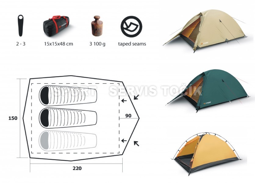Turistický stan Trimm - popis: Model Trimm COMET pro 2 — 3 osoby, s tradiční konstrukcí a vyjímečnou délkou pro větší komfort uživatele. Dostatečná absida zajišťuje prostor pro uložení zavazadel. Výhodou stanu je nízká hmotnost a rychlá stavba.