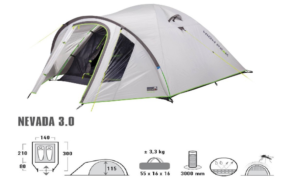 Turistický stan High Peak - popis: - popis: vDvouplášťový stan High Peak Nevada 3 pro 3 osoby ideální pro vaše výlety do přírody. Stan poskytne mnoho důležitého prostoru a zároveň vás ochrání před vlhkostí díky vodnímu sloupci a lepeným švům.