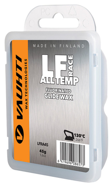 Vosk Vauhti - popis: LF – race fluorinated. Vosky Vauhti LFr jsou určené pro aktivní lyžaře nebo jako tréninkový vosk pro závodníky. Fluorizovaný vosk vyhovuje pro všechny typy sněhu a povětrnostní podmínky.
